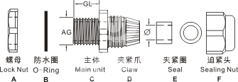 产品特性:特殊夹紧爪与密封件相扣之设计,配合迫紧头装配省时便利,夹紧电缆范围大,抗拉力特强,